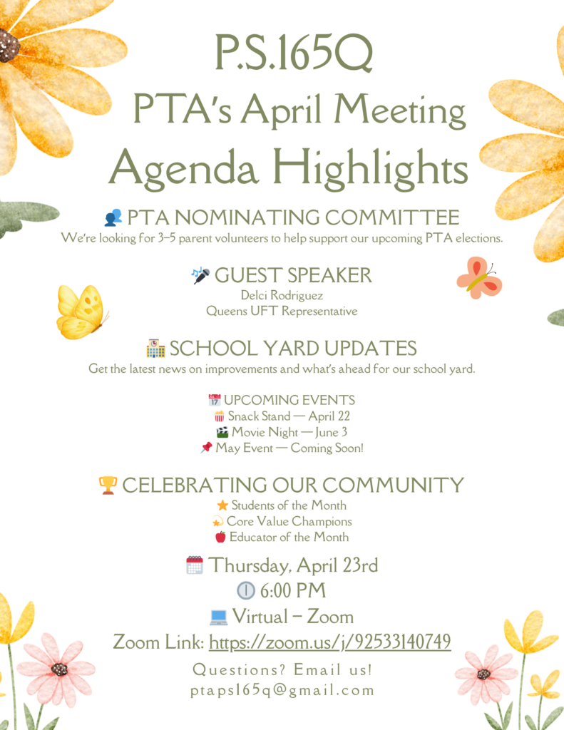 Our April PTA meeting is taking place on April 23, 2026 VIRTUAL via ZOOM . Details below: